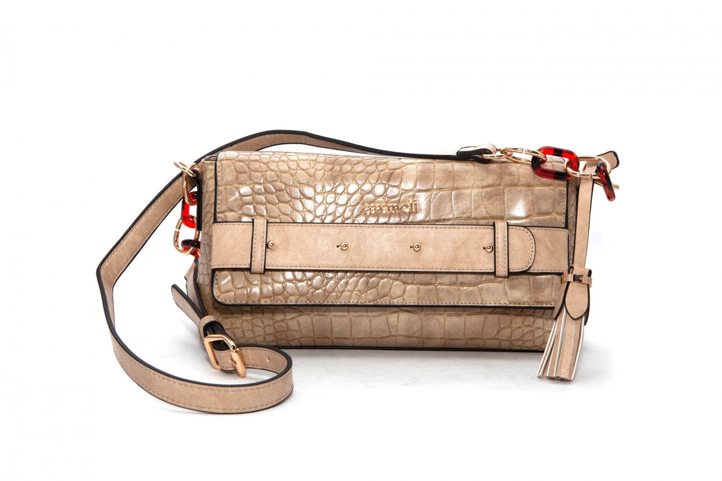 PEPE MOLL bolso de asa larga,tipo baguette con detalle de eslabon en asa color carey en piel coco cierre iman