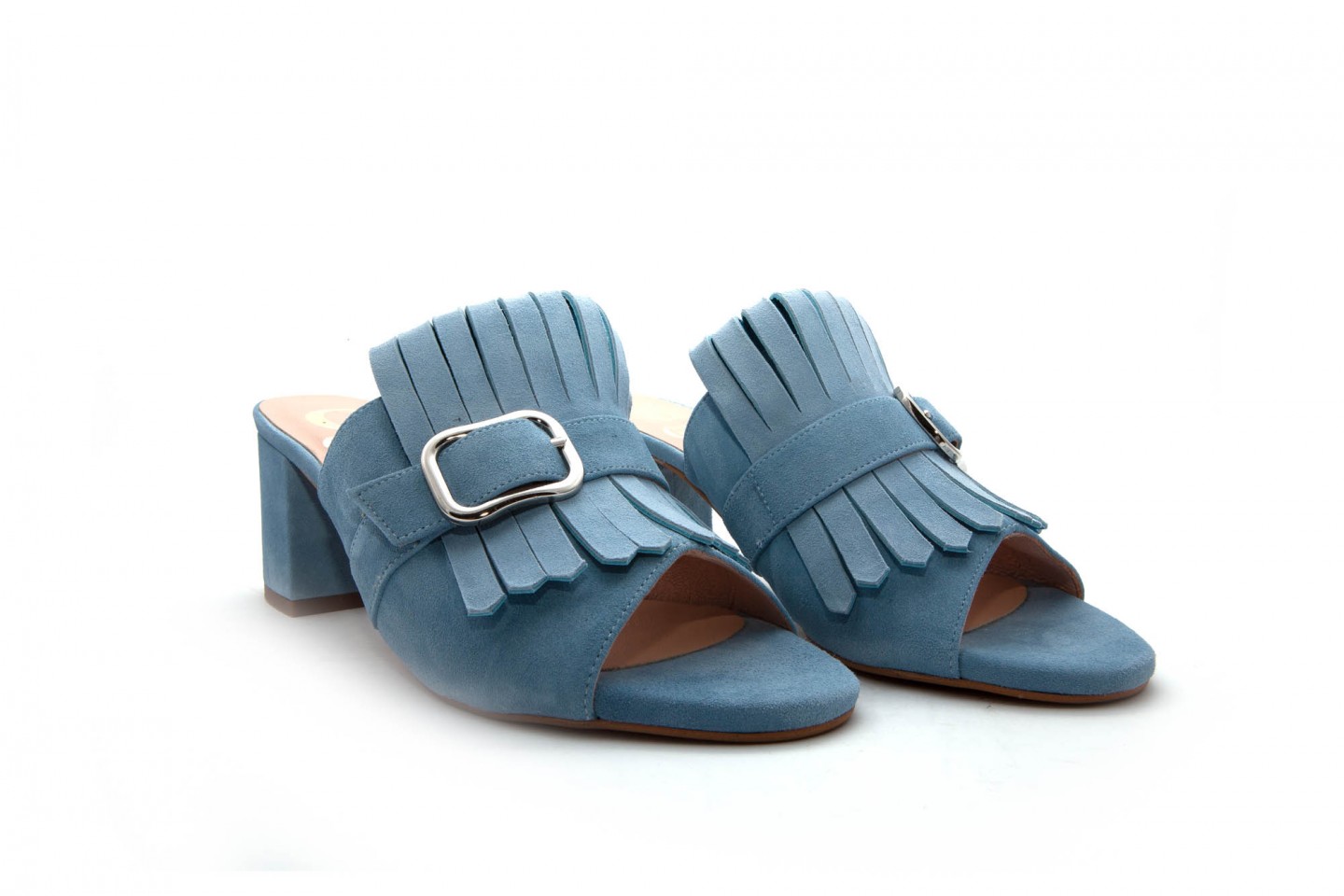 Sandalia tipo mule de ante, con detalle de hebilla y fleco en pala. Altura tacón 7cm.
