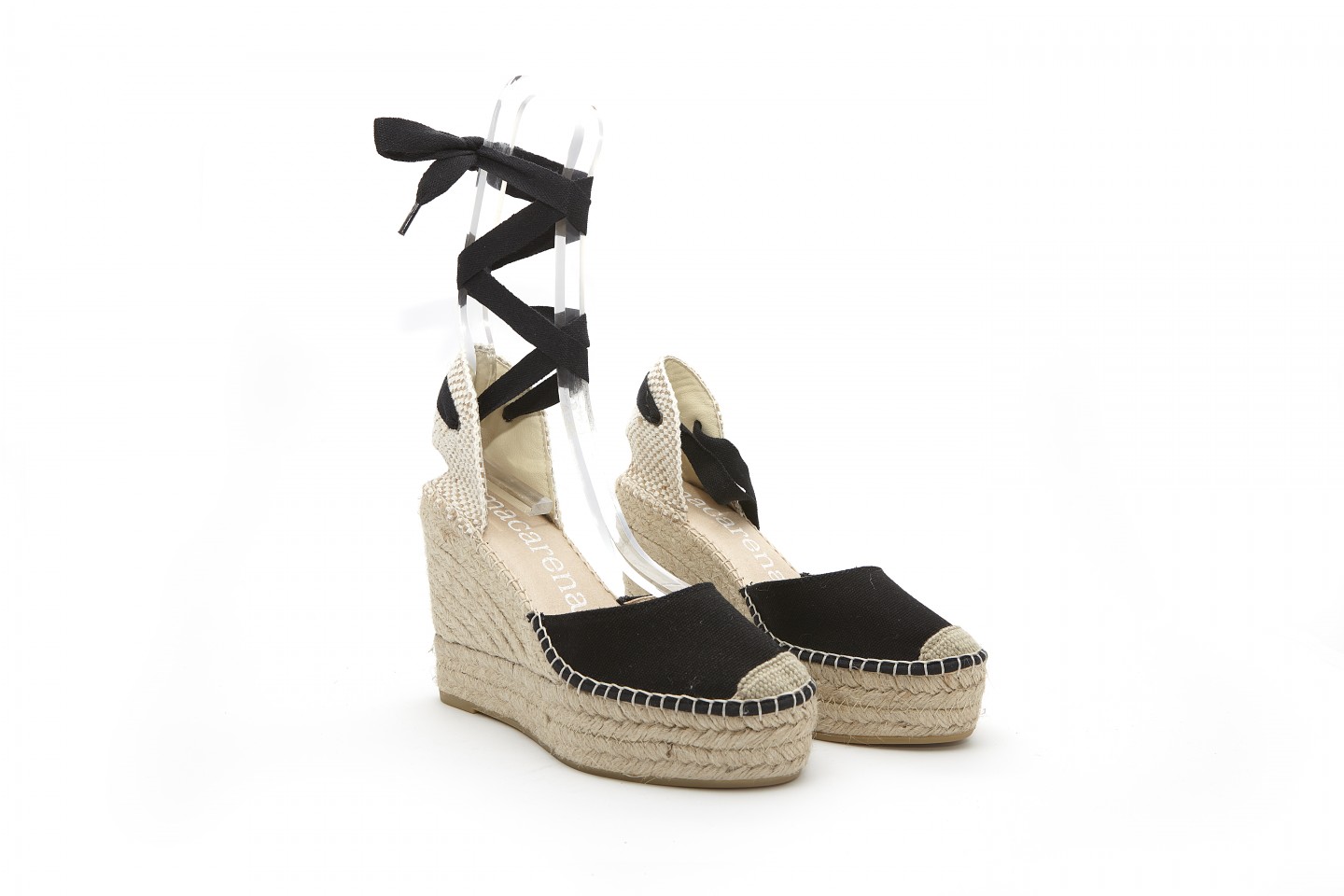 MACARENA alpargata con cuña elborada en algodon negro, cierre con cintas atadas