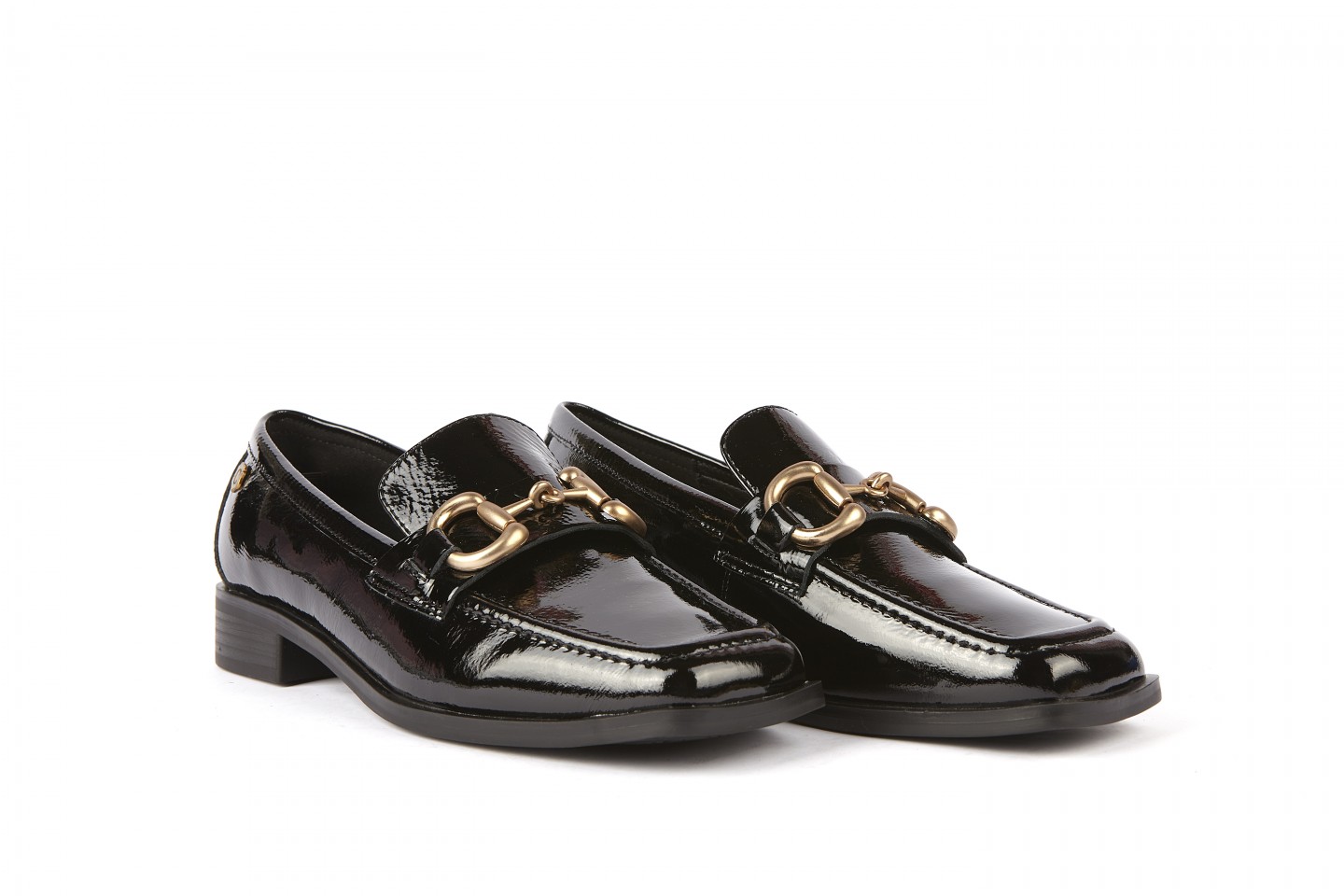 CARMELA mocasin en piel acabada en charol, antifaz en pala decorativo con