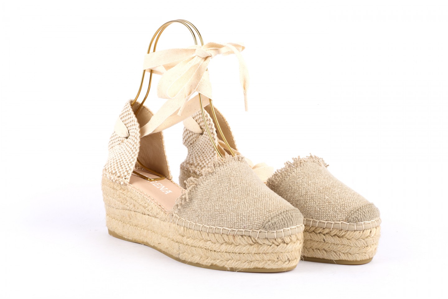 MACARENA alpargata con cuña diseño desflecado de lino, con talonera