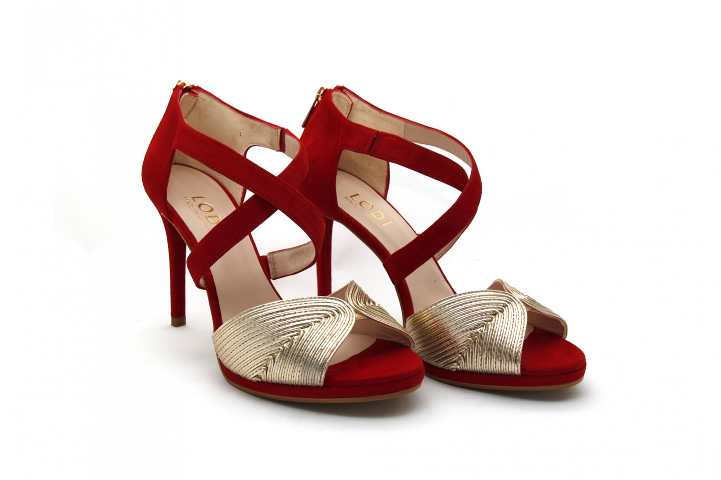 Sandalia LODI cpm tacón fino de 10cm, en piel color rojo combinado con tira en color oro y cremallera trasera.