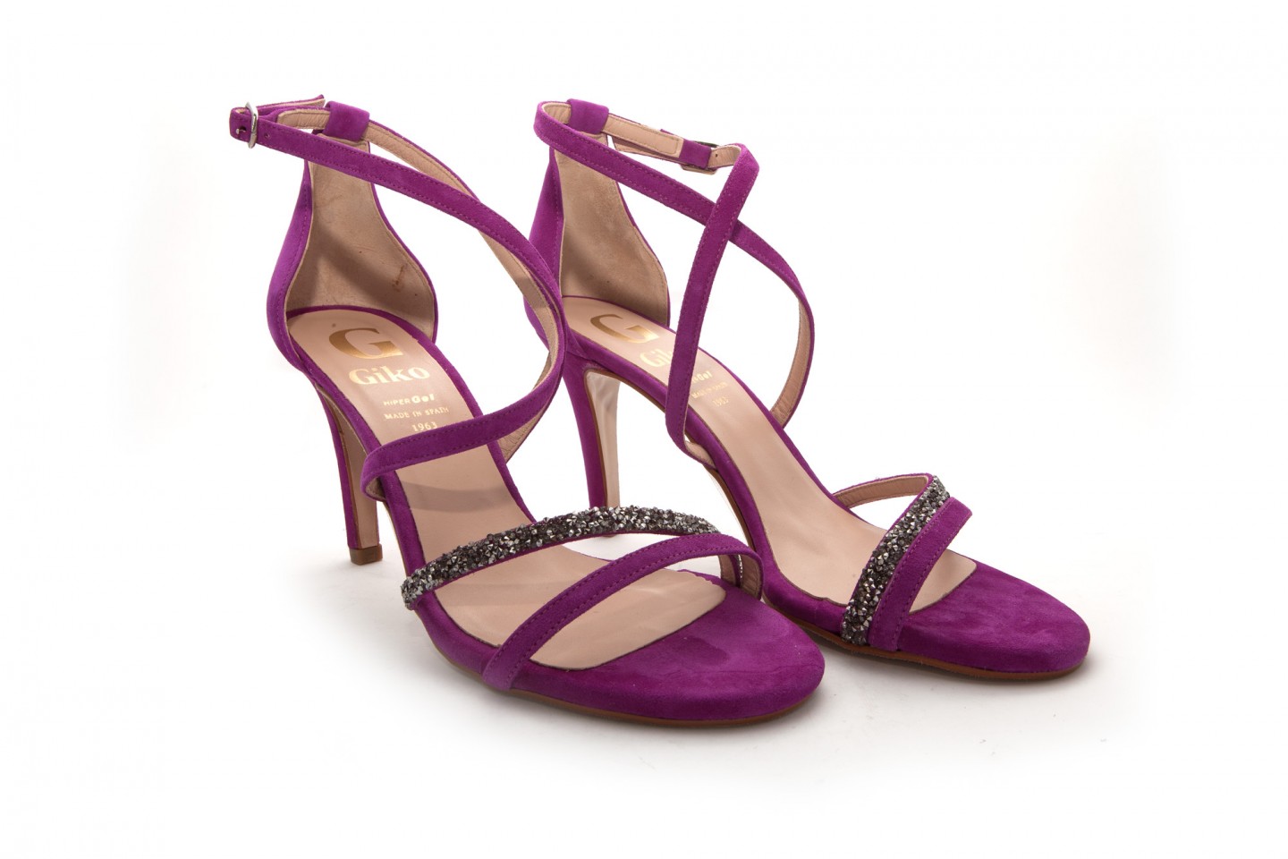 Sandalia GIKO en ante; tiras delanteras con adornos STRASS antracita. Tiras cruzadas y sujeción al tobillo. Tacón de 8cm.