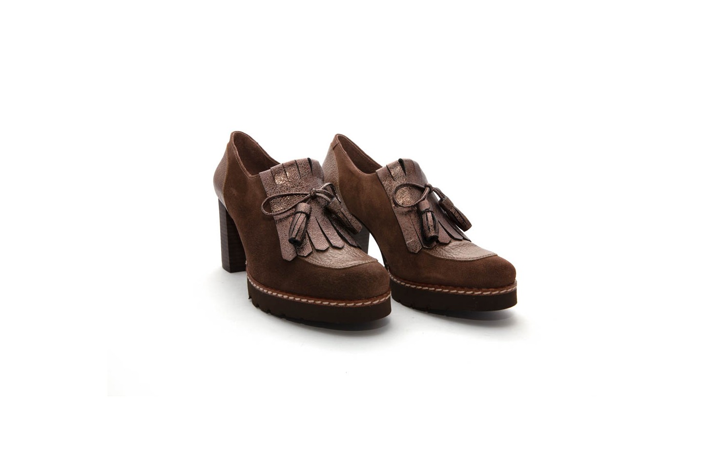 Zapato GIKO combinado en antelina y piel con un adorno de borlas en la parte frontal y una plataforma de madera de 1,5cm. Tacón efecto madera de 7,5cm.